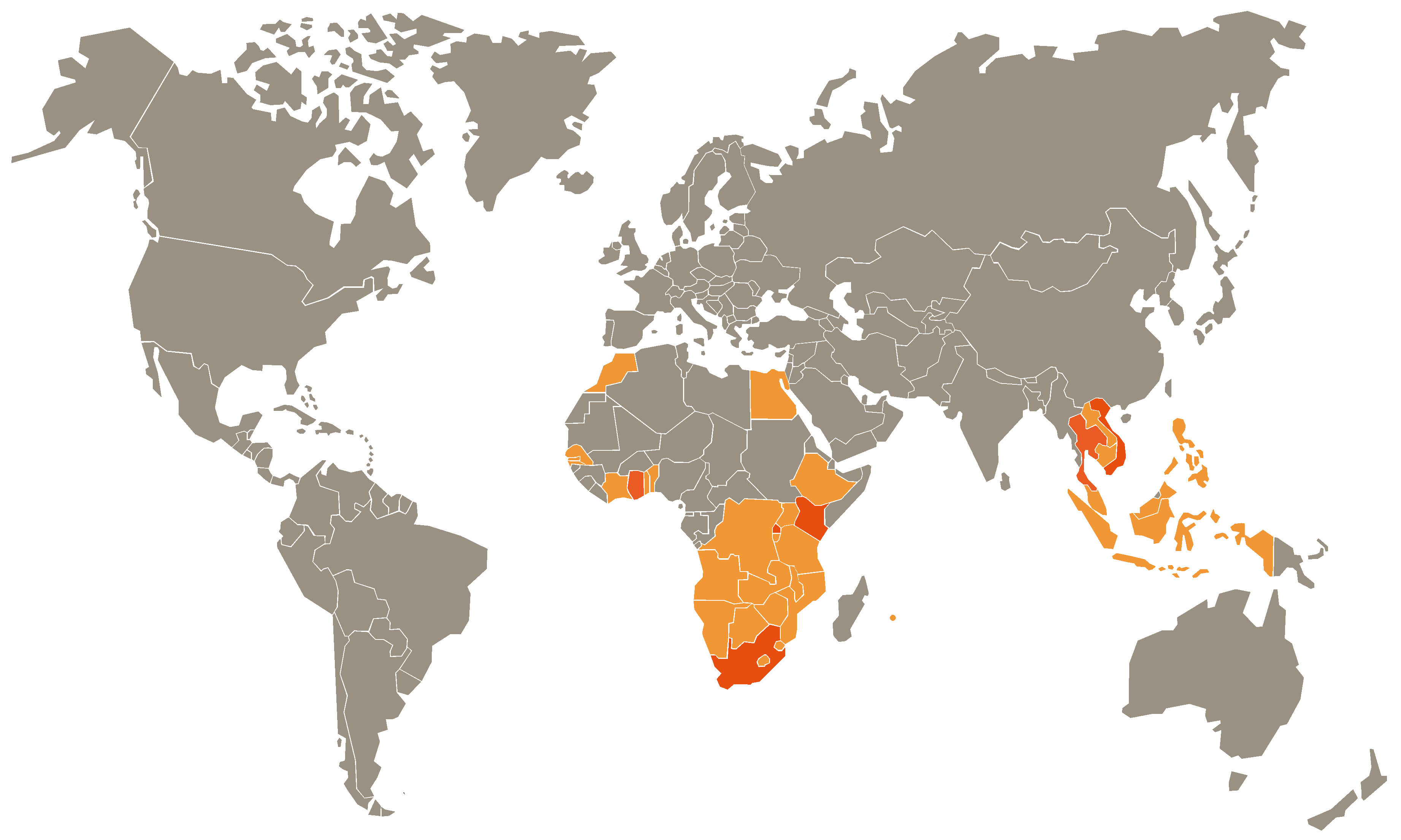 Angola, Benin, Burundi, Botswana, DR Congo (Kivu), Egypt, eSwatini, Ethiopia, Gambia, Ghana, Guinea, Ivory Coast, Kenya, Lesotho, Malawi, Mauritius, Morocco, Mozambique, Namibia, Rwanda, Senegal, South Africa, Tanzania, Togo, Uganda, Zambia, Zimbabwe